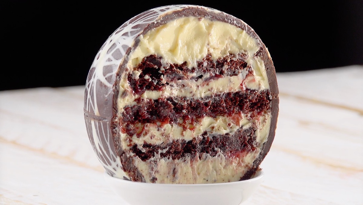 Schneide mit einem warmen Messer vorsichtig die Kugel entzwei und sieh dir an, wie schön der Schoko-Ball im Inneren geschichtet ist. Was für ein hübsches und außergewöhnliches Dessert! Perfekt für einen besonderen Anlass wie Geburtstag, Jubiläum oder Ähnliches.