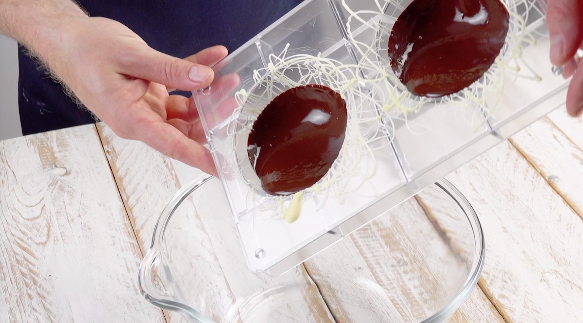 1.) Schmilz die weiße und die dunkle Blockschokolade über je einem heißen Wasserbad. Spritze mit einem Löffel ein paar Spritzer der weißen Schokolade in beide runden Halbkugel-Formen. Daraufhin gibst du die geschmolzene dunkle Schokolade in die beiden Formen und drehst sie so lange, dass die Form rundherum mit dunkler Schokolade ausgekleidet ist. Drehe die Form nun auf den Kopf und lass die überschüssige dunkle Schokolade in eine separate Schüssel laufen.