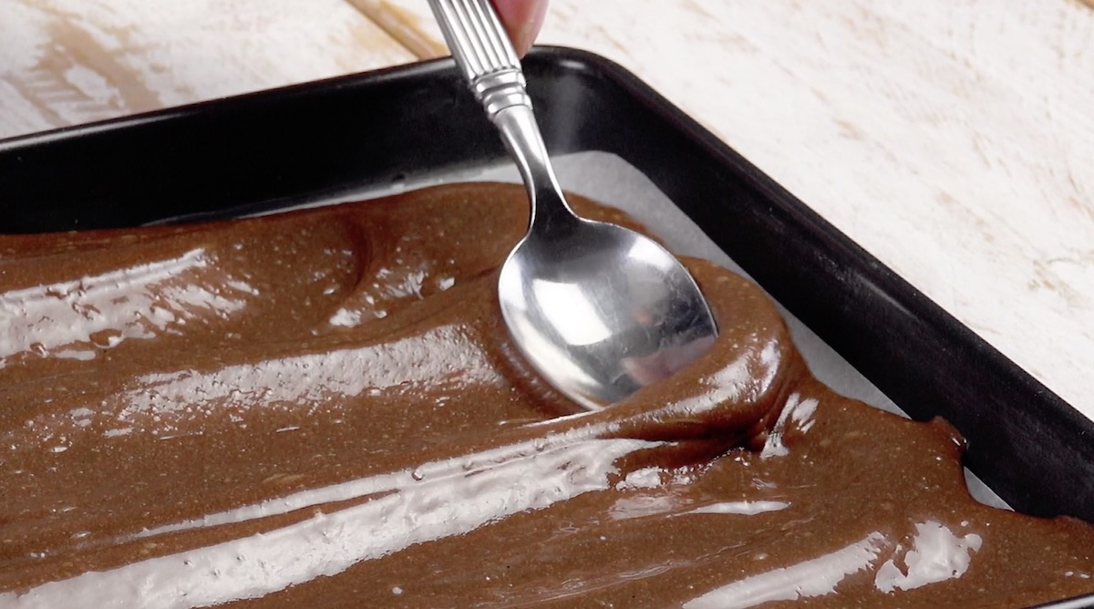 2.) In genau diese Schüssel mit der restlichen geschmolzenen dunklen Schokolade gibst du nun die gewürfelte Butter hinzu. Lass das Ganze über einem heißen Wasserbad schmelzen und vermenge es, sodass eine gleichmäßige Masse entsteht. Nachdem sich die Butter-Schokoladen-Mischung etwas abgekühlt hat, fügst du drei Eier, braunen Zucker, Backpulver und Mehl hinzu. Vermenge alles mit einem Handmixer und gib den fertigen Brownie-Teig auf ein mit Backpapier ausgelegtes Blech. Streiche alles mit einem Löffel glatt und stelle das Blech bei 180 °C Ober- und Unterhitze für 15 Minuten in den Ofen.