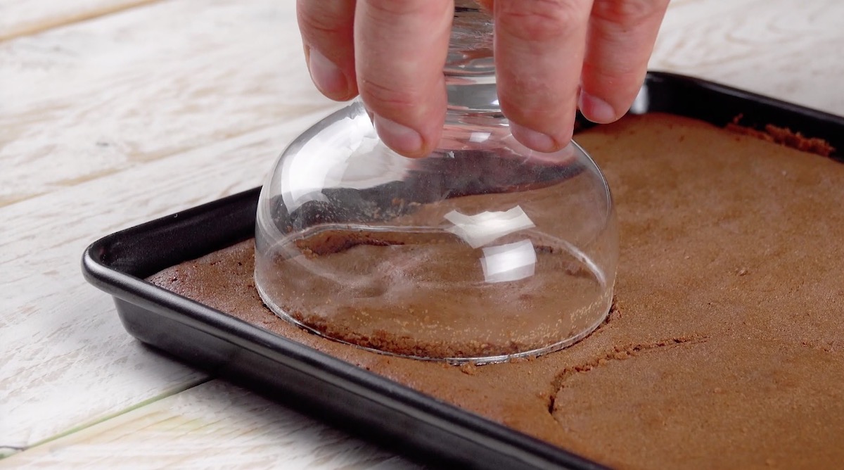 Nach 15 Minuten Backzeit holst du den fertigen Brownieteig aus dem Ofen und stichst mit einer kleinen Schüssel oder mit einem Glas sechs Kreise aus dem Teig aus. Achte darauf, dass die Kreise nur minimal kleiner sind als die Kugel-Form aus Schritt 1.