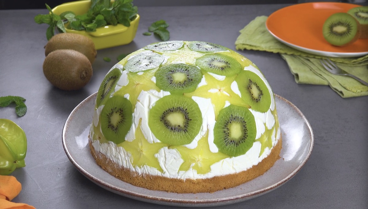 Dessert & Kuchen in einem: köstliche Kuppel aus Sternfrucht, Kiwis, Joghurt und Biskuitboden