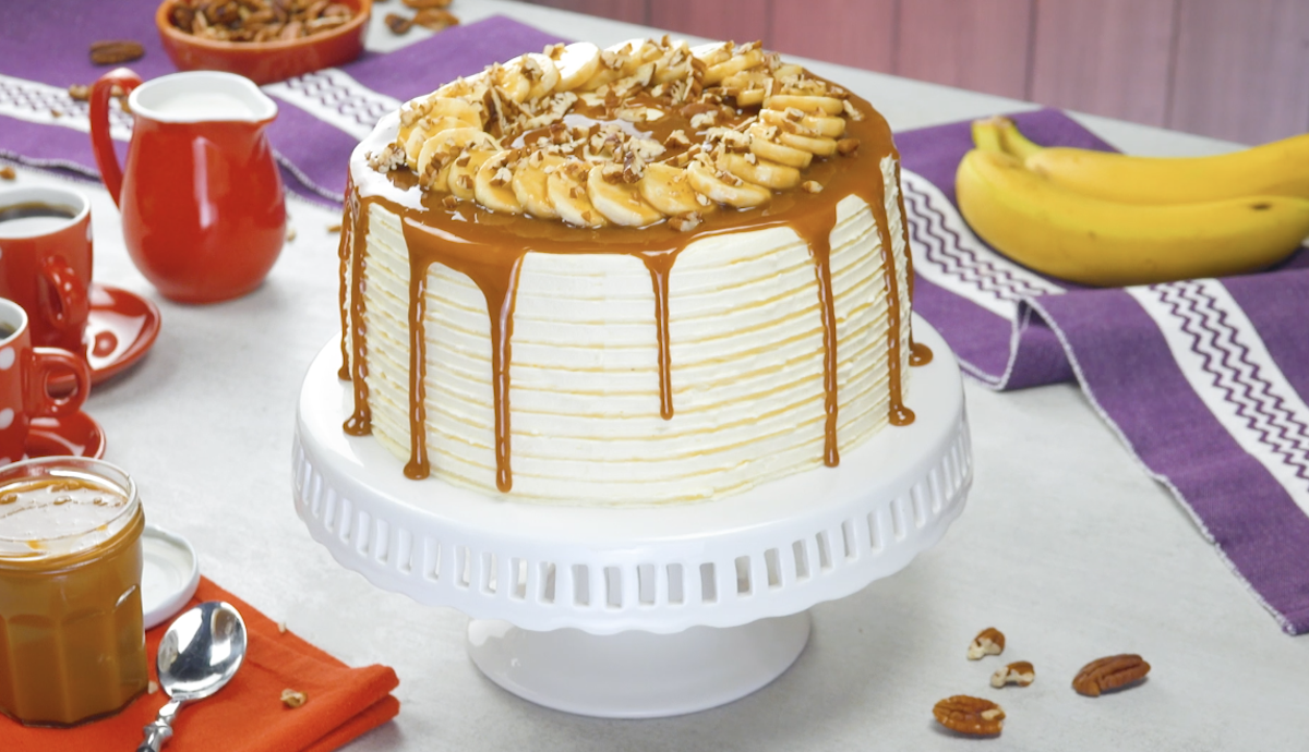 Aufgepasst! Mit diesem Rezept werden Kuchenträume wahr. Wir backen 3 Kuchenböden und stapeln diese mit selbstgemachter Karamellsoße und Buttercreme. Verfeinert wird die Leckerei noch mit Bananen und kleingehackten Pekannüssen. Ein Kuchen, der nach großem Können aussieht, in der Zubereitung aber recht simpel ist. Das richtige Rezept, um in deiner Familie oder deiner WG anzugeben. Was für ein schmackhafter Leckerbissen! Dafür brauchst du: Für die Tortenböden: