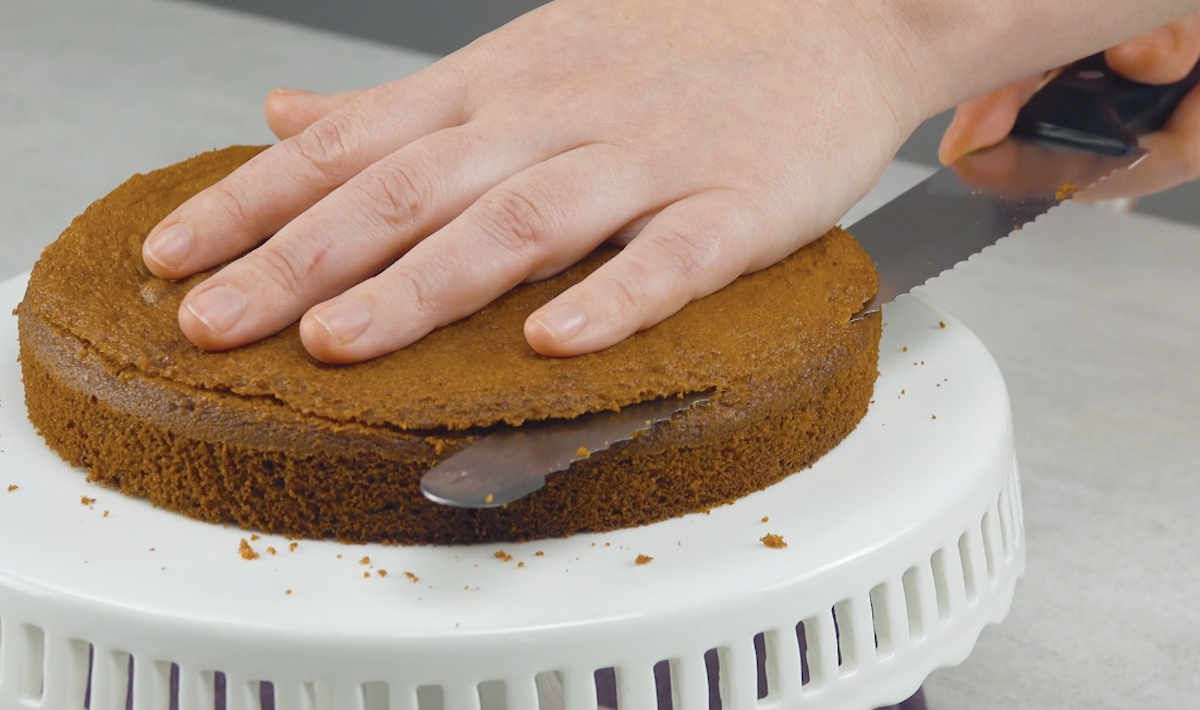2. Hole die Böden aus ihrer Form und lege den ersten vor dich hin. Schneide die Oberseite mit einem Messer ab.