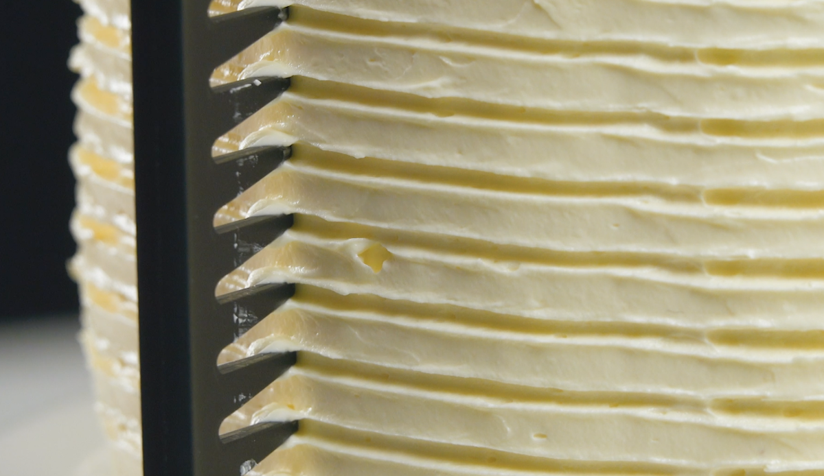 7. Als Letztes kommt der dritte Kuchenboden obendrauf. Kleide den kompletten Kuchen mit der Buttercreme ein und ziehe mit einem unbenutzten Kamm Rillen in die Creme. Stelle den Kuchen anschließend für ca. 1 Stunde kalt.