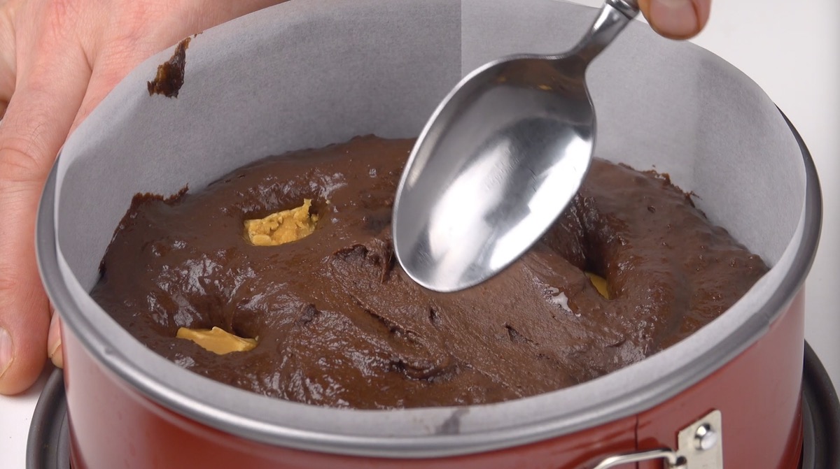 So geht es: 1.) Vermische für den Teig Mehl, Kakaopulver, Zucker und Backpulver. Füge dann Pflanzenöl, Milch und Vanillearoma hinzu und verrühre alles zu einem cremigen Teig. Fülle den Teig dann in eine mit Backpapier ausgekleidete Springform (ca. 18 cm Durchmesser).