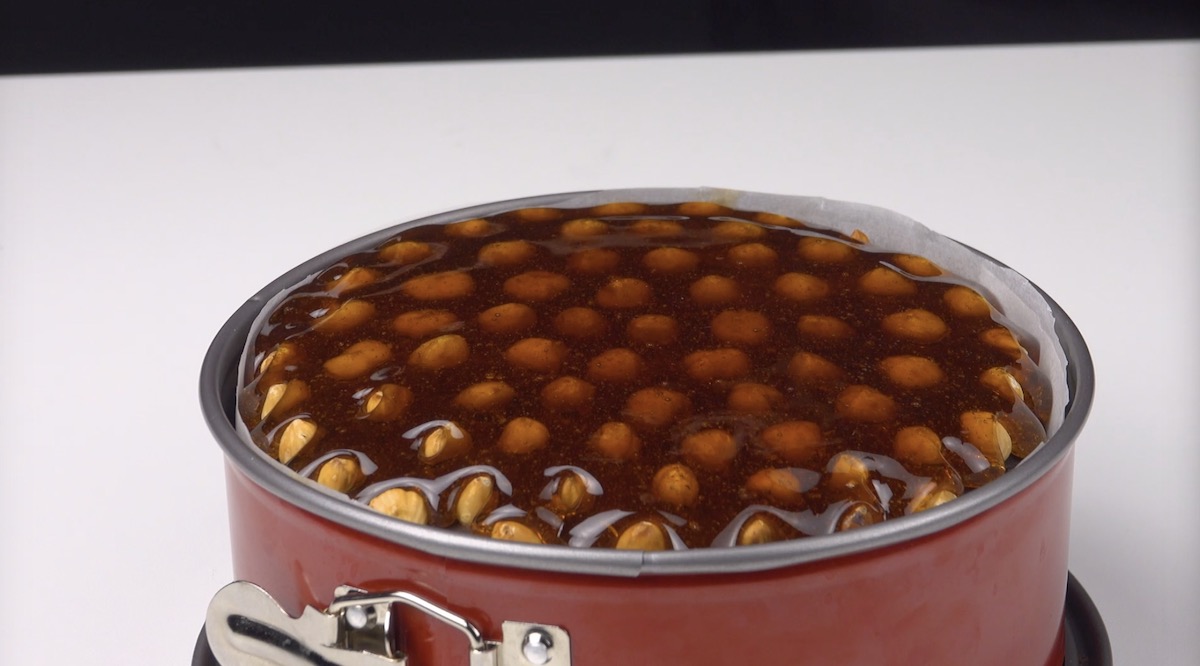 5.) Drehe nun die Springform um. Da das Karamell zähflüssig geworden ist, „fällt“ es nun langsam senkrecht herunter. Warte, bis das Karamell vollständig erstarrt ist, und drehe die Form dann wieder herum. Bei Bedarf kannst du die Spitzen noch mit einer Schere abschneiden.