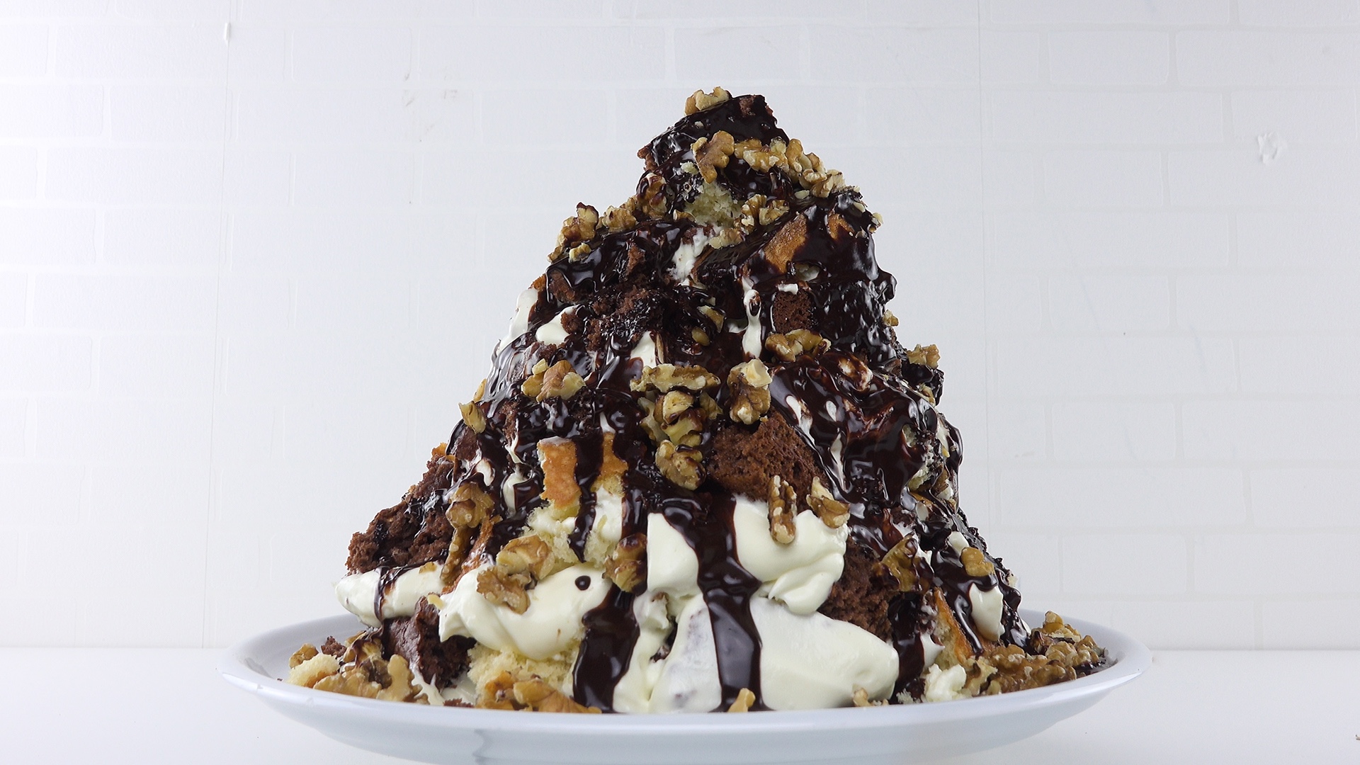 7.) Danach stichst du mit einem großen Messer mehrfach rundherum in den Kuchen. Es mag auf den ersten Blick sinnlos erscheinen, doch dabei erzeugst du eine Art Tunnelsystem. Garniere den Kuchenberg danach mit Schokosoße, die durch das Einstechen auch in das Berginnere läuft, und streue so viele Walnüsse auf, wie du magst.