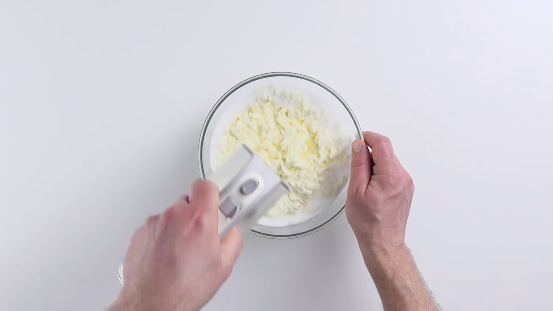 4.) Schlage in der Zwischenzeit 1.000 Gramm Crème fraîche und 200 Gramm Zucker miteinander auf.