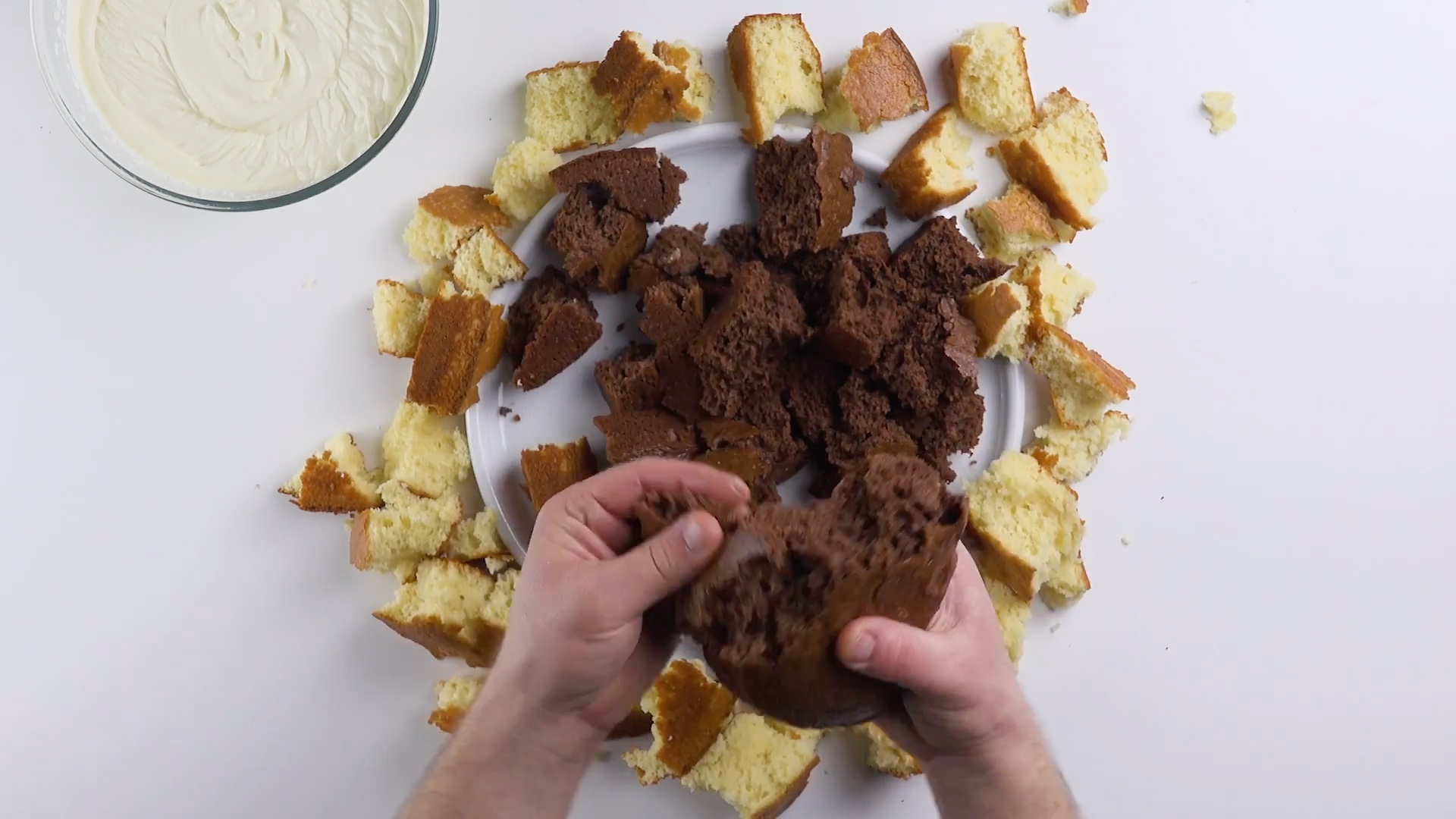 5.) Löse die ausgekühlten Kuchen nach dem Backen aus den Springformen und brich beide in grobe Stücke.