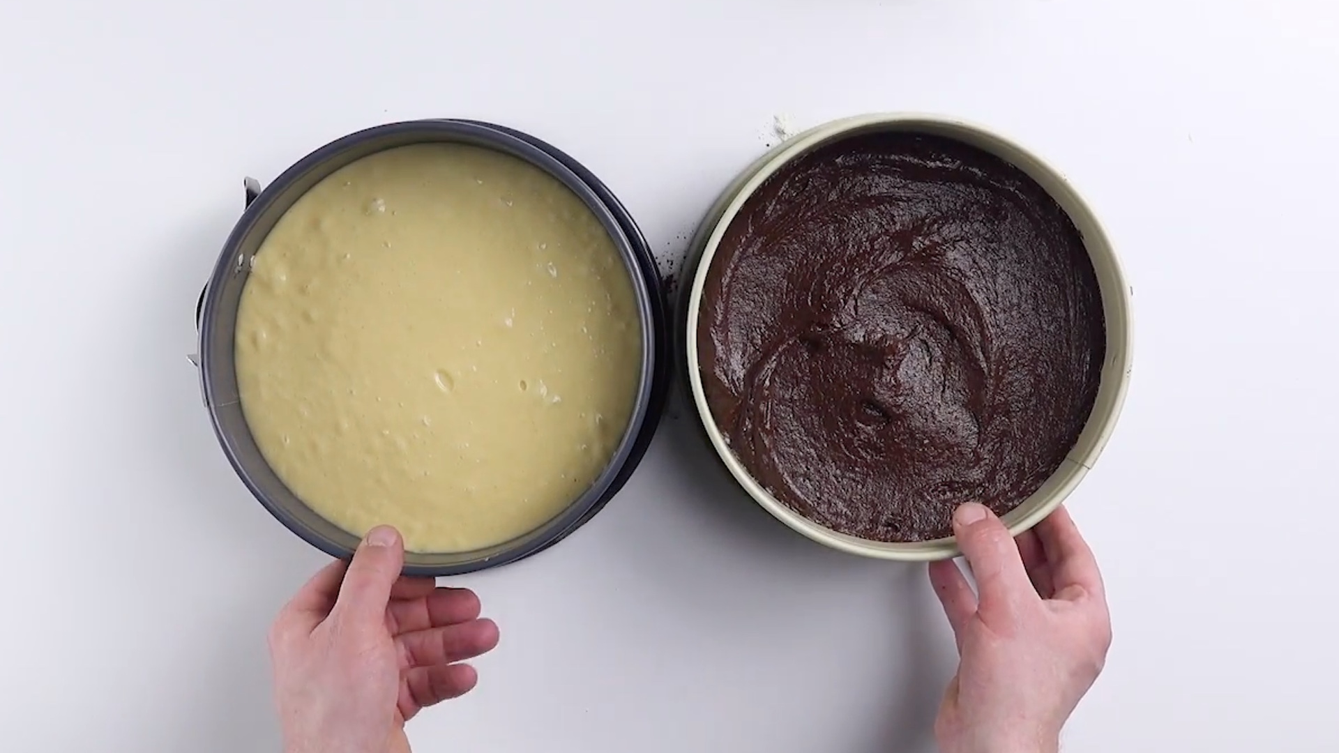 3.) Fülle die Teige getrennt in zwei Springformen und backe sie bei 175 °C (Umluft) für 30 Minuten.