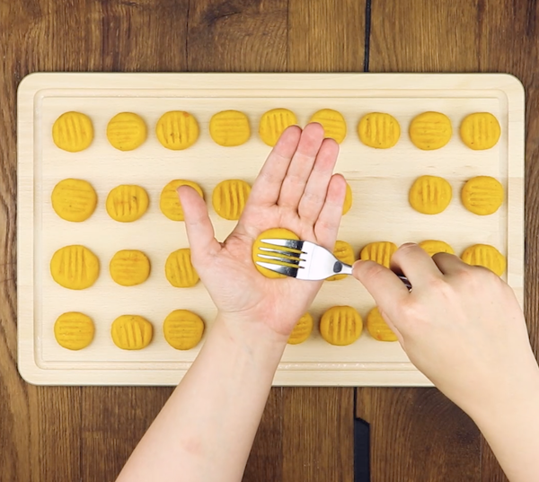 4.) Teile den Teig in vier gleich große Stücke und rolle diese auf einer leicht bemehlten Arbeitsfläche zu gleichmäßigen Würsten. Schneide die Teigwürste in gleich große Stücke, die du zu Kugeln formst. Diese drückst du mit einer Gabel flach.