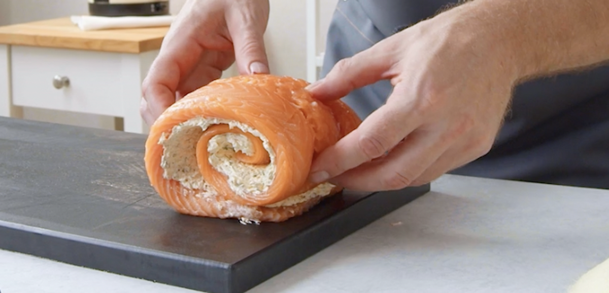 2. Tupfe das Lachsfilet trocken und drehe die Unterseite nach oben. Streiche den Fisch mit Kräuterbutter ein und rolle ihn auf.