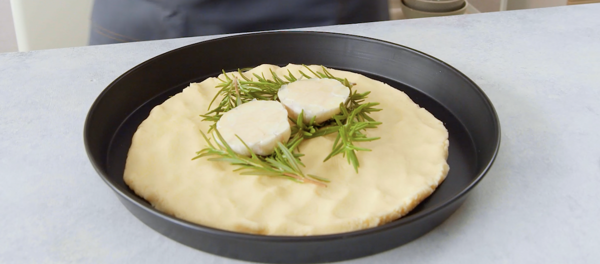 3. Drücke 1/3 des Salzteigs auf ein Backblech und bedecke das Zentrum mit Rosmarin sowie den halbierten Knoblauchzehen.