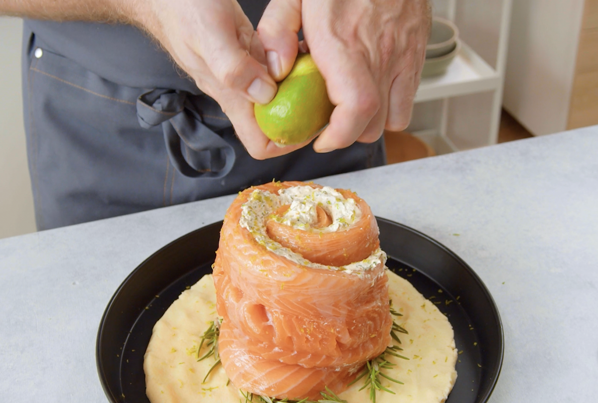 4. Stelle nun die Lachsrolle darauf. Reibe die Schale der Limette und drücke den Saft heraus. Verteile dann beides über der Lachsrolle.