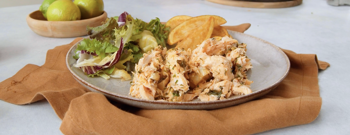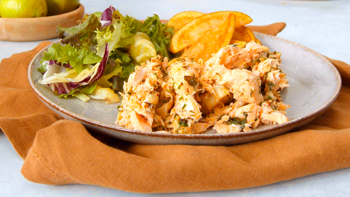9. Entnehme dem Salzteig vorsichtig den Lachs sowie den Spinat. Dazu schmecken Kartoffelspalten und Salat.