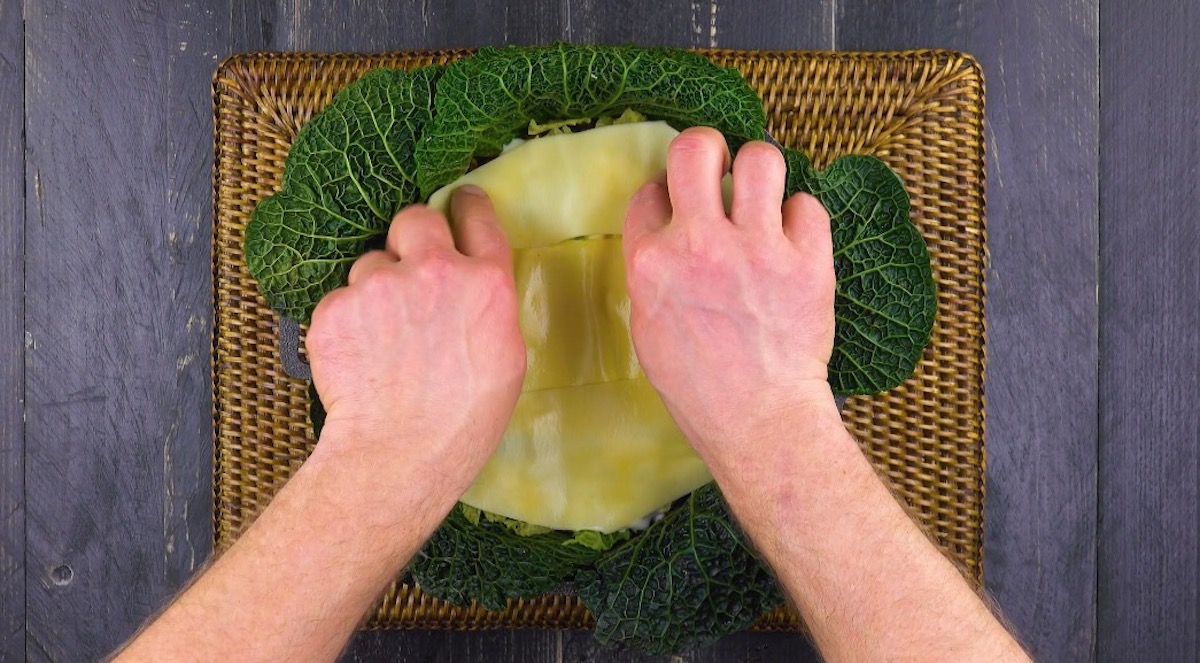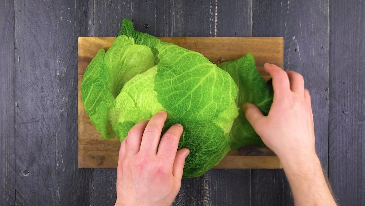 So geht es: 1.) Koche einen Wirsingkohl ca. 10 Minuten in heißem Wasser.