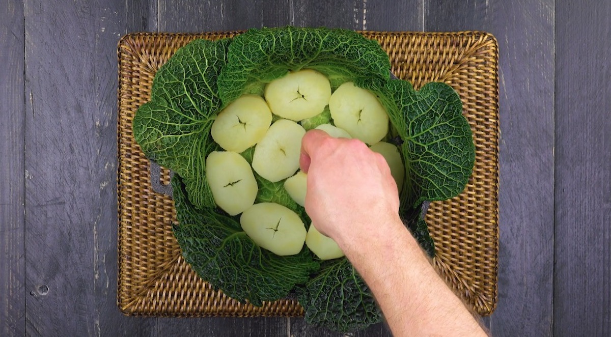 4.) Lege nun einen Topf mit den Wirsingblättern so aus, dass sie den Rand überlappen. Beginne dann zu schichten: Als Erstes legst du eine Lage Kartoffelscheiben auf die Wirsingblätter.