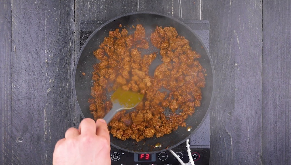 3.) Brate das Hackfleisch in einer Pfanne an und würze es mit gehacktem Knoblauch, Paprikapulver, Kreuzkümmel, Salz und Pfeffer.