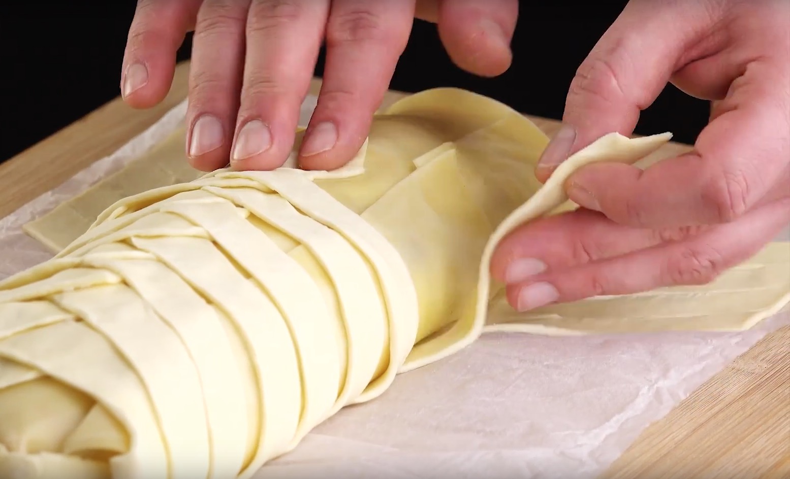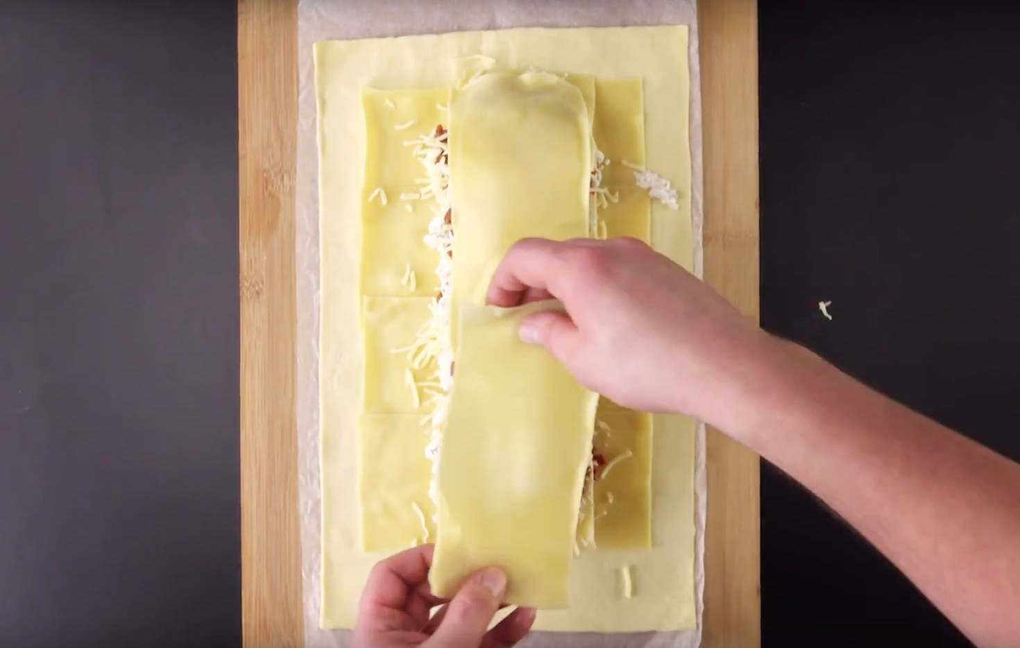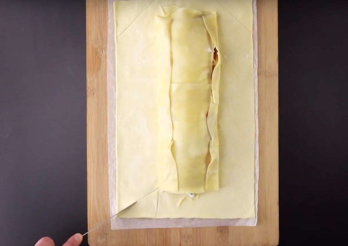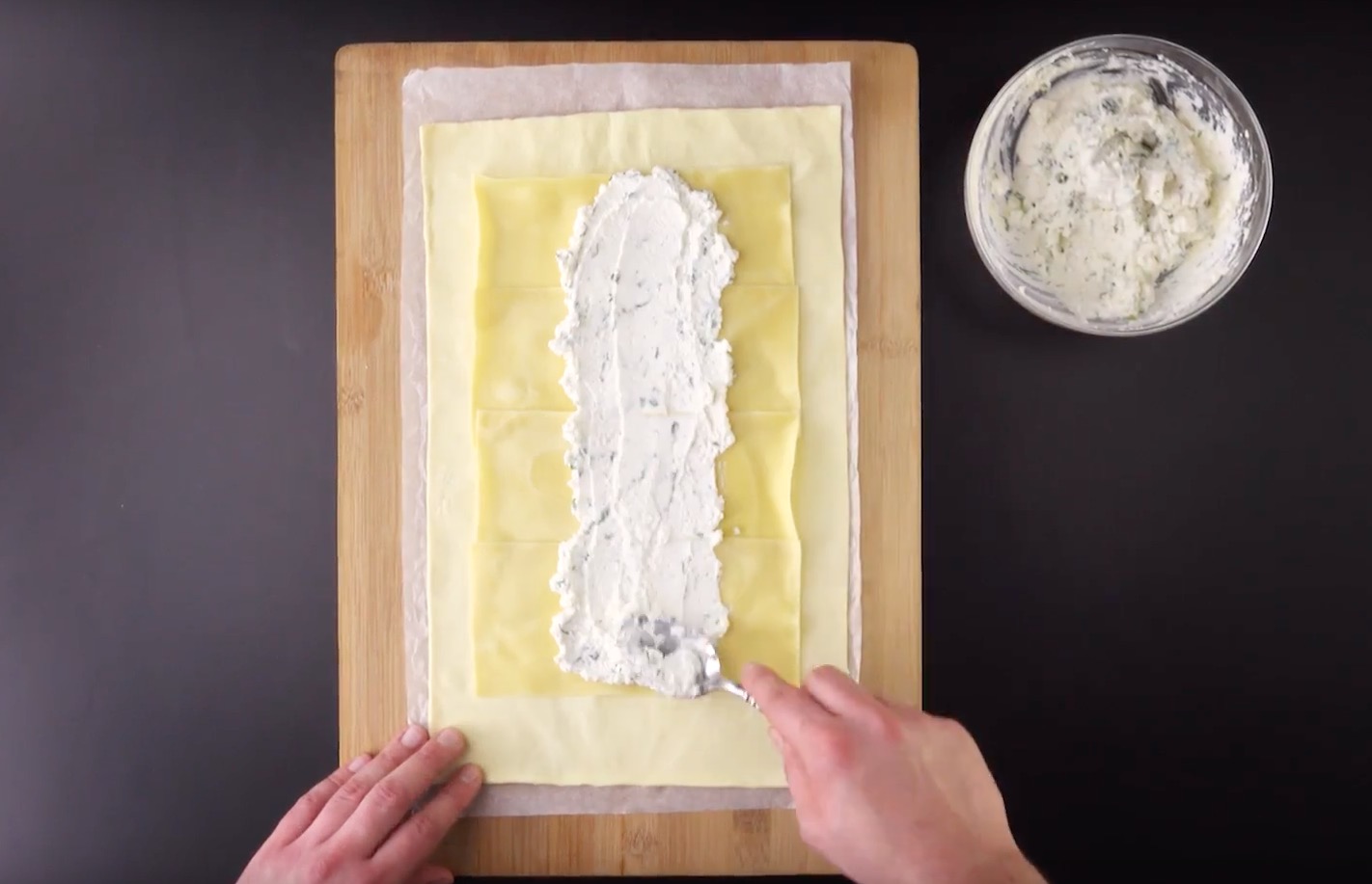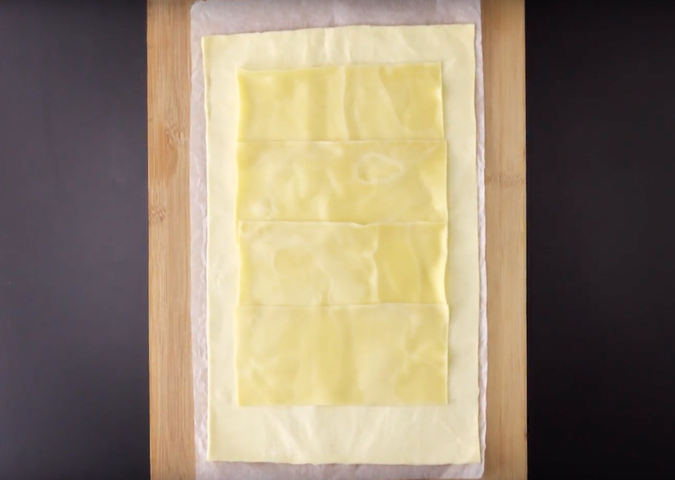 1.) Lege zuerst den Blätterteig auf Backpapier auf deine Arbeitsfläche. Drehe eine der kurzen Seiten zu dir.