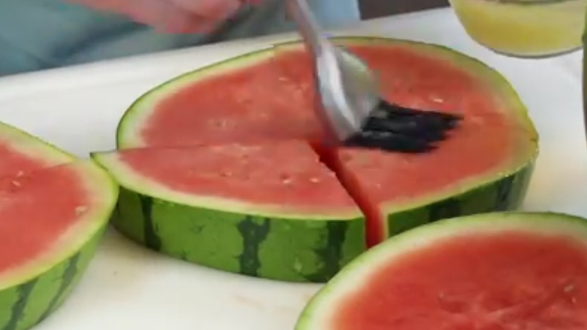 Als nächstes brauchst du einen Pinsel, mit dem du die Wassermelone mit Limetten-Saft bestreichst. Auf beiden Seiten!
