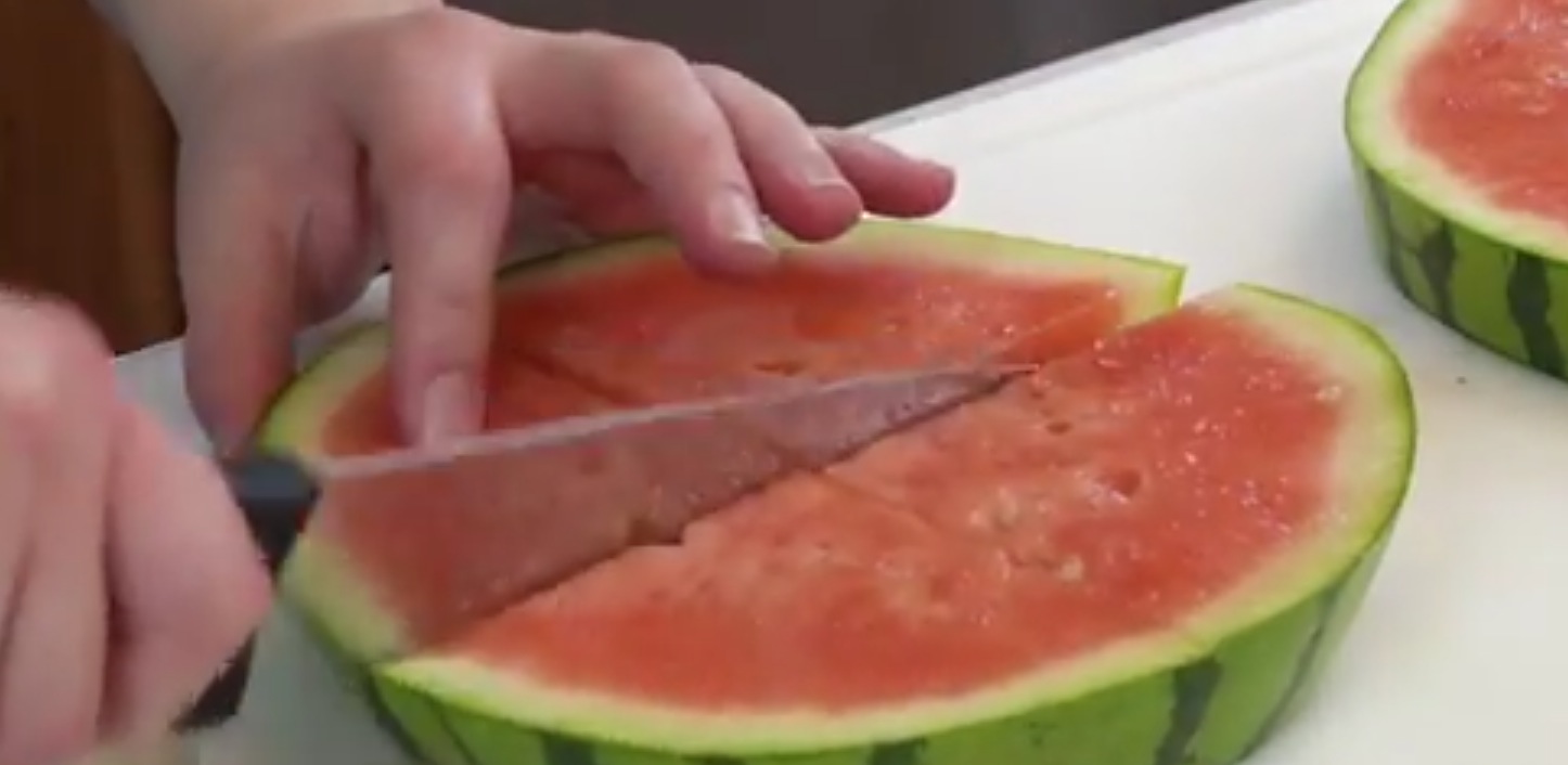 Als erstes musst du die Melone in 3 bis 4 Zentimeter dicke Scheiben schneiden und sie dann vierteln.