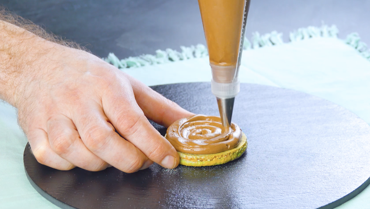 4. Für die Schokocreme schlägst du Nutella mit Butter cremig auf. Fülle auch diese Mischung in einen Spritzbeutel und gib die Creme spiralförmig auf eine Macaron-Spirale.