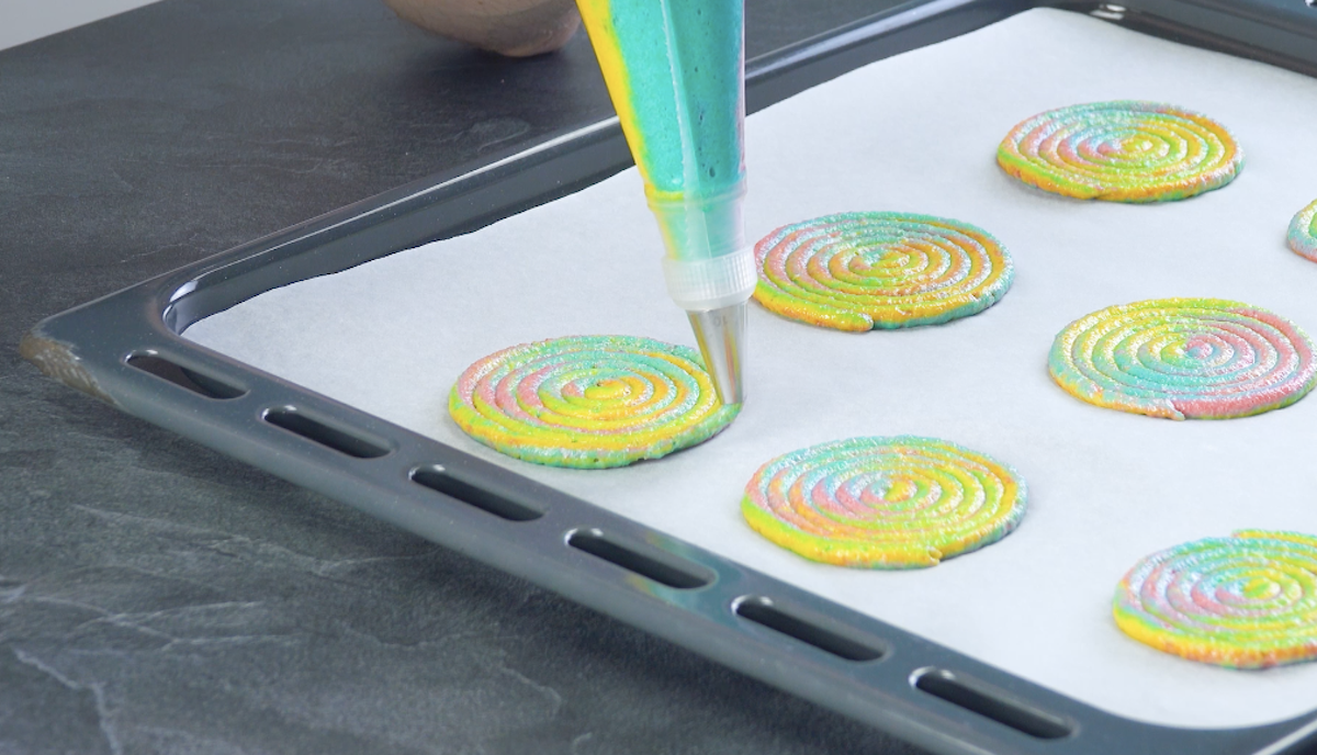 3. Fülle alle drei Eischnee-Massen in einen Spritzbeutel mit Lochtülle und spritze bunte Spiralen auf ein mit Backpapier ausgelegtes Backblech. Schiebe das Blech bei 150 °C Ober- und Unterhitze für 12 Minuten in den Ofen. Lasse die Macaron-Spiralen danach völlig auskühlen.