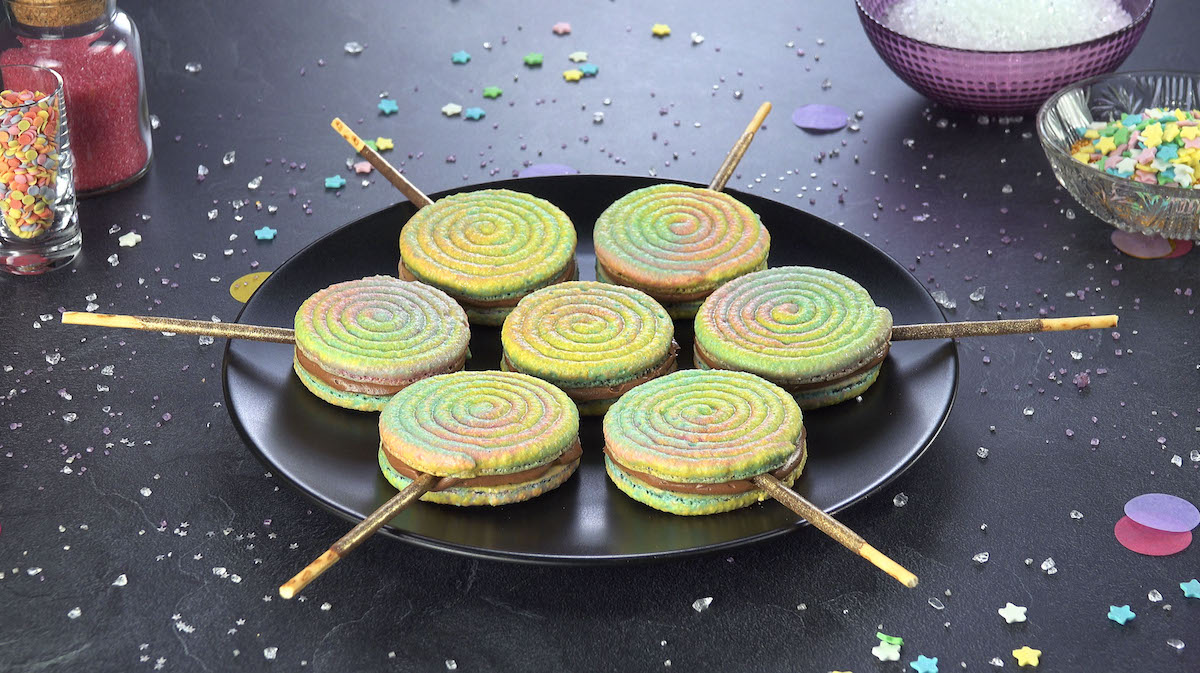 Märchenhafte Macarons mit Glitzer! Macarons am Stiel mit Schokocreme und Mikado Stäbchen. Dieses leckere Baisergebäck ist sowohl optisch als auch geschmacklich ein richtiger Genuss.