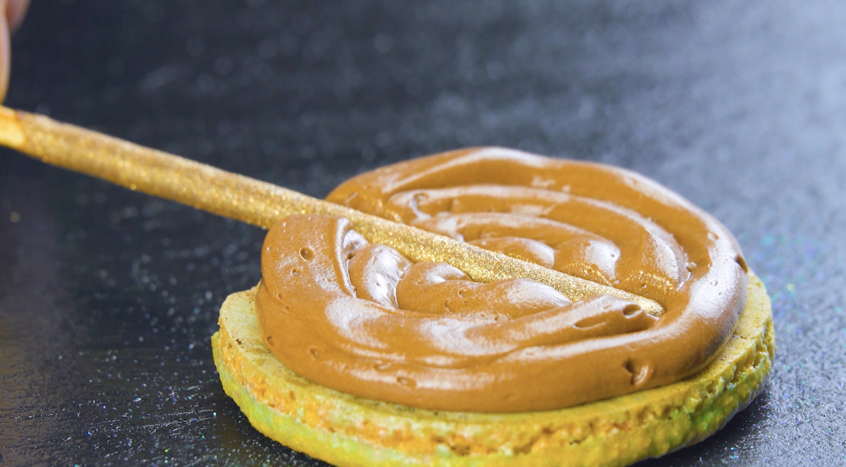6. Gib noch etwas Schokocreme auf das Mikado-Stäbchen und drücke dann eine weitere Macaron-Spirale auf die Creme.