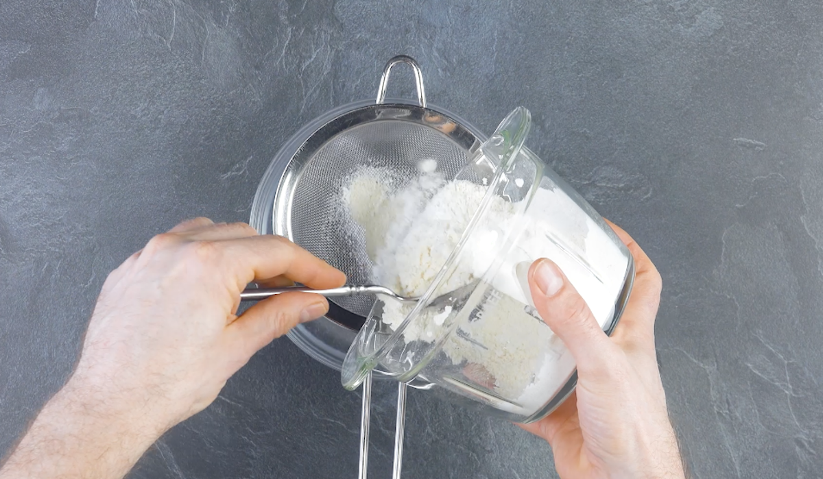 1. Gib Puderzucker mit gemahlenen Mandeln in eine Moulinette und mahle alles fein. Siebe diese Mischung durch ein Sieb in eine Schüssel.
