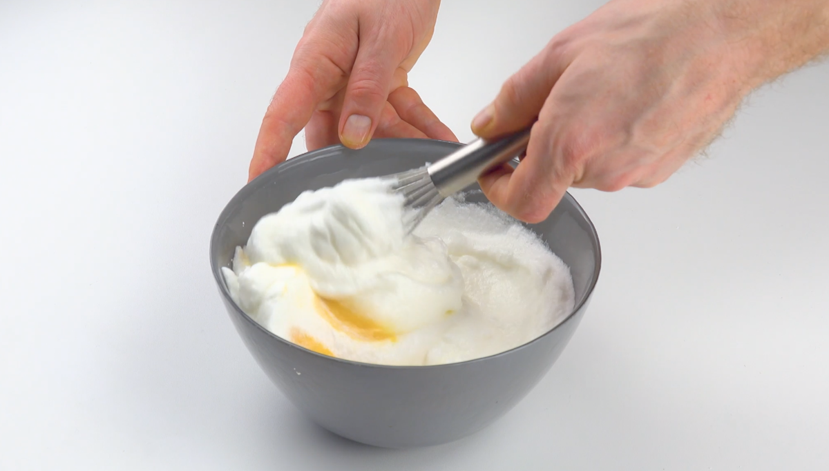 2.) Schlage das Eiweiß zuerst nur an und gib den restlichen Puderzucker nach und nach hinzu. Danach schlägst du das Eiweiß steif. Hebe das feste Eiweiß dann vorsichtig unter die Eigelb-Masse.