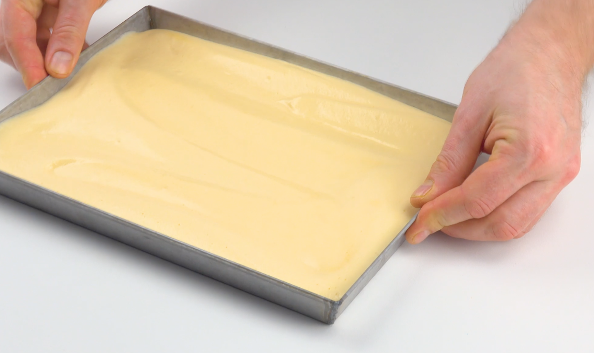 3.) Gib den Teig auf ein mit Backpapier ausgelegtes Backblech (25 x 28 cm) und streiche ihn glatt. Schiebe das Blech bei 180 °C Umluft für 10 Minuten in den Ofen.