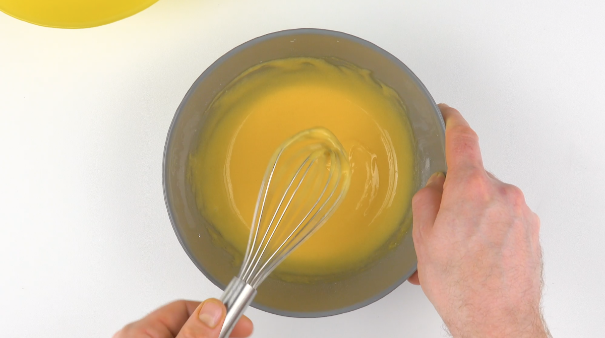 1.) Gib 4 Eigelb in eine Schüssel und verrühre sie mit 60 g Puderzucker. Füge das gesiebte Mehl, das Olivenöl und die Milch hinzu und vermenge alles mit einem Schneebesen.