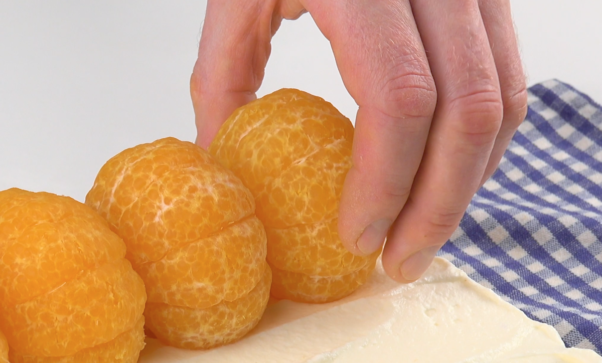 Schäle dann 5 Mandarinen so, dass die weiße Haut komplett vom Fruchtfleisch entfernt ist. Nun beginnt der „Zusammenbau“. Verteile die Sahnecreme auf dem Biskuitteig, der auf dem Geschirrtuch liegt. Platziere die 5 Mandarinen am unteren Ende des Teiges.