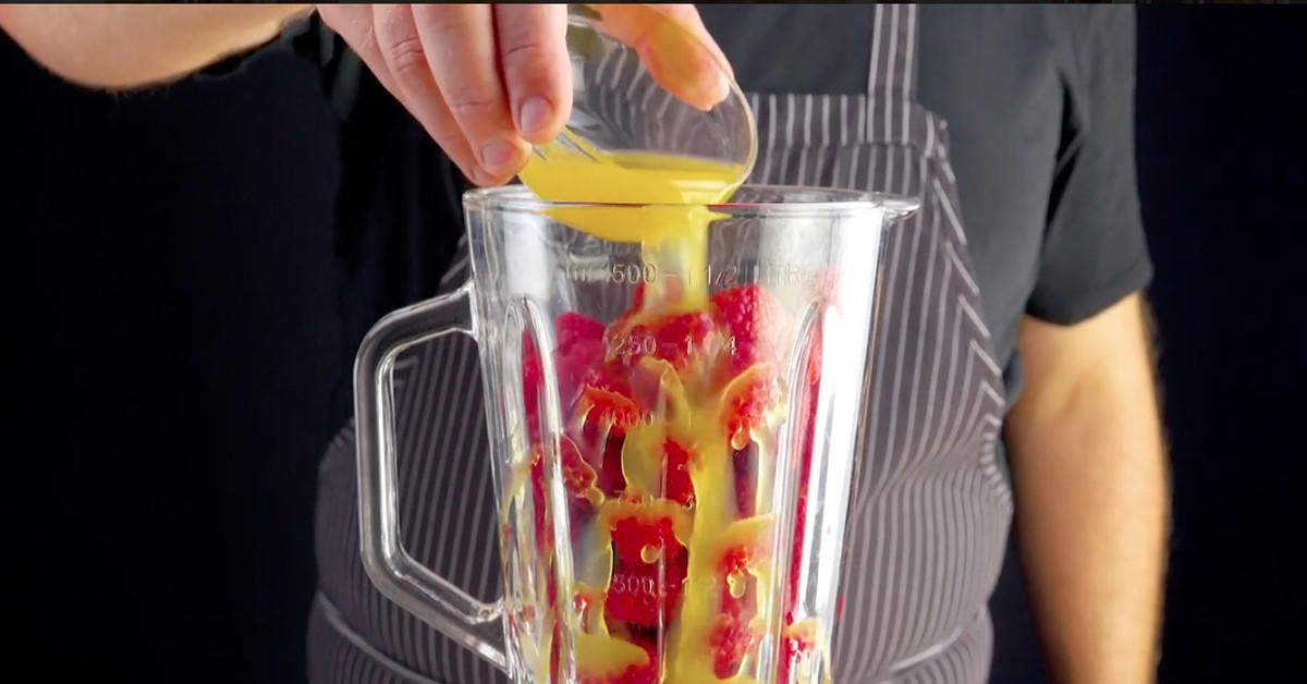 2.) Gib die Himbeeren, den Orangensaft, die Marmelade und das Vanillearoma in einen Mixer und püriere alles gut durch. Koche dann die Mischung in einem Topf auf, bevor du die Gelatine unterrührst. Werde die Himbeerkerne los, indem du alles durch ein feines Sieb streichst, und lasse die Mischung dann abkühlen.