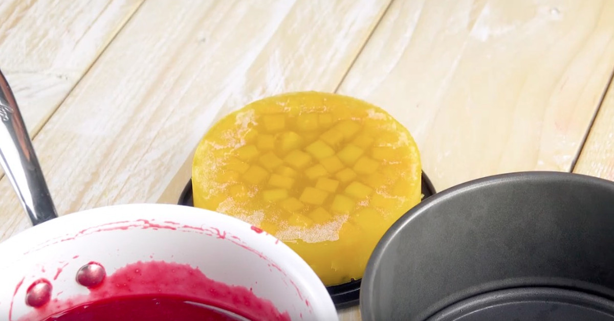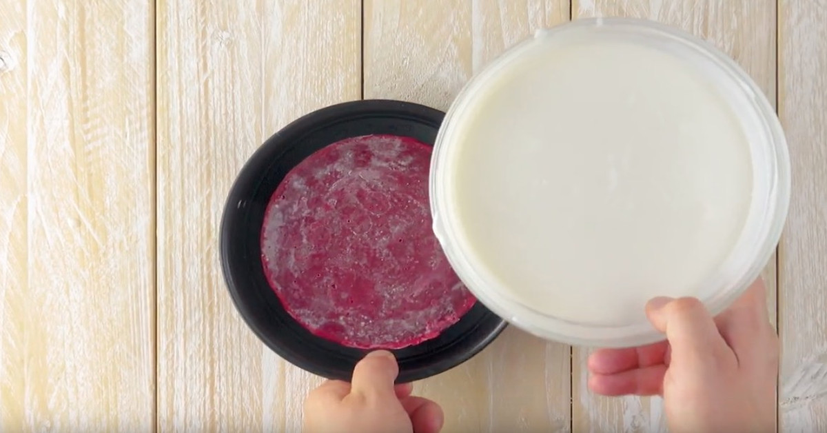 3.) Nimm die fest gewordene Passionsfruchtmischung aus dem Gefrierfach und lege sie in eine Form, die etwas größer ist. Schütte nun die Himbeercreme darüber und stelle das Ganze zurück ins Gefrierfach.