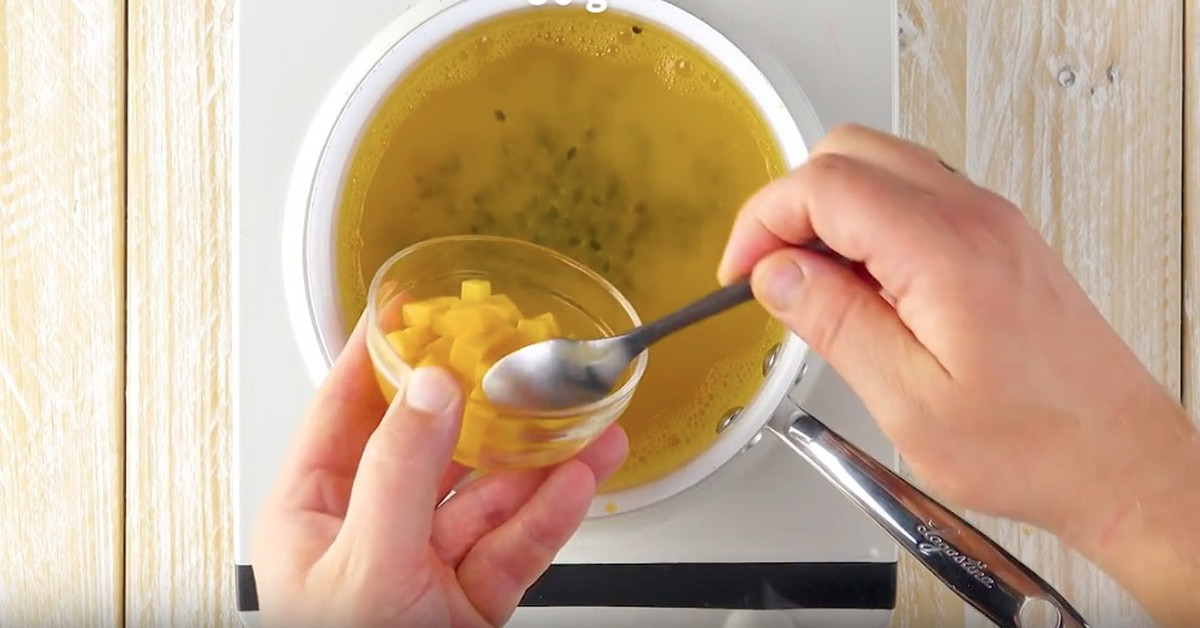 1.) Schmilz den Zucker im Topf und lösche ihn mit dem Passionsfruchtsaft ab. Gib die Passionsfrüchte hinzu und koche alles kurz auf, bevor du die eingeweichte Gelatine einrührst. Lass die Mischung abkühlen, bis sie lauwarm ist, und mische die Mangowürfel darunter. Fülle sie anschließend in eine Form und stelle sie ins Gefrierfach.