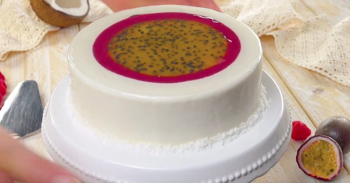 Jetzt kommt alles zusammen: Lege die fest gewordene Passionsfrucht-Himbeer-Scheibe umgedreht in eine noch größere Form und schütte vorsichtig die Sahne-Kokos-Mousse darüber.