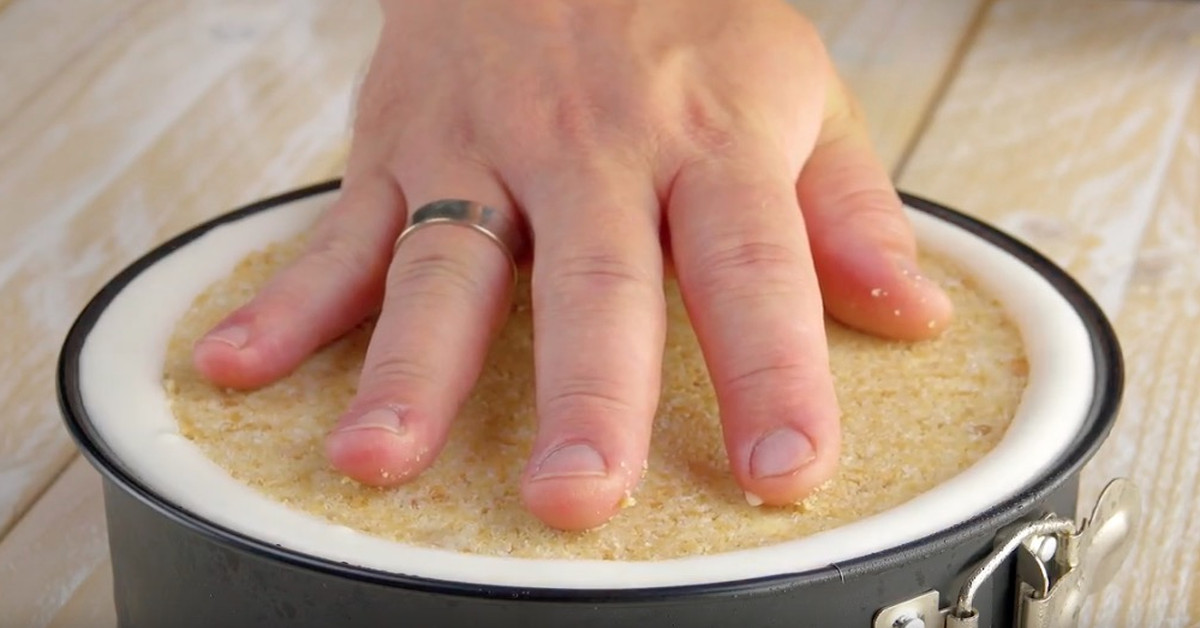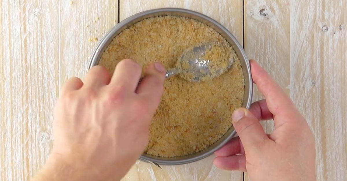 4.) Zerdrücke die Butterkekse zu feinen Krümeln und vermenge sie mit den Kokosraspeln und der geschmolzenen Butter. Fülle die Masse in die Form, die so groß ist wie die der Passionsfrucht-Himbeer-Scheibe und stelle sie in den Kühlschrank.