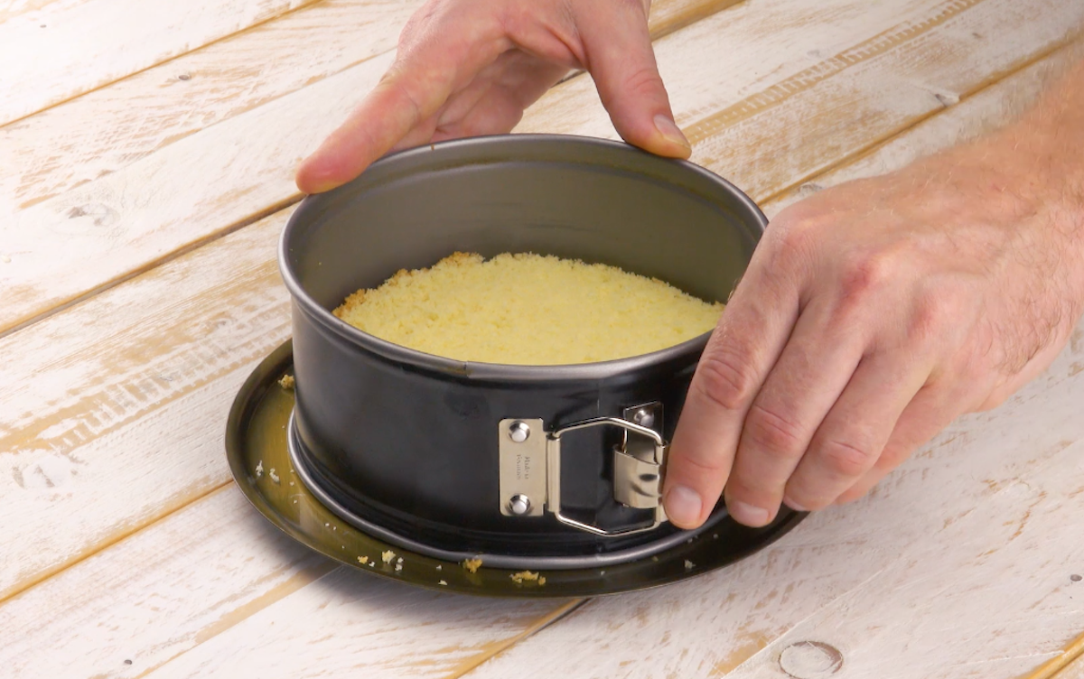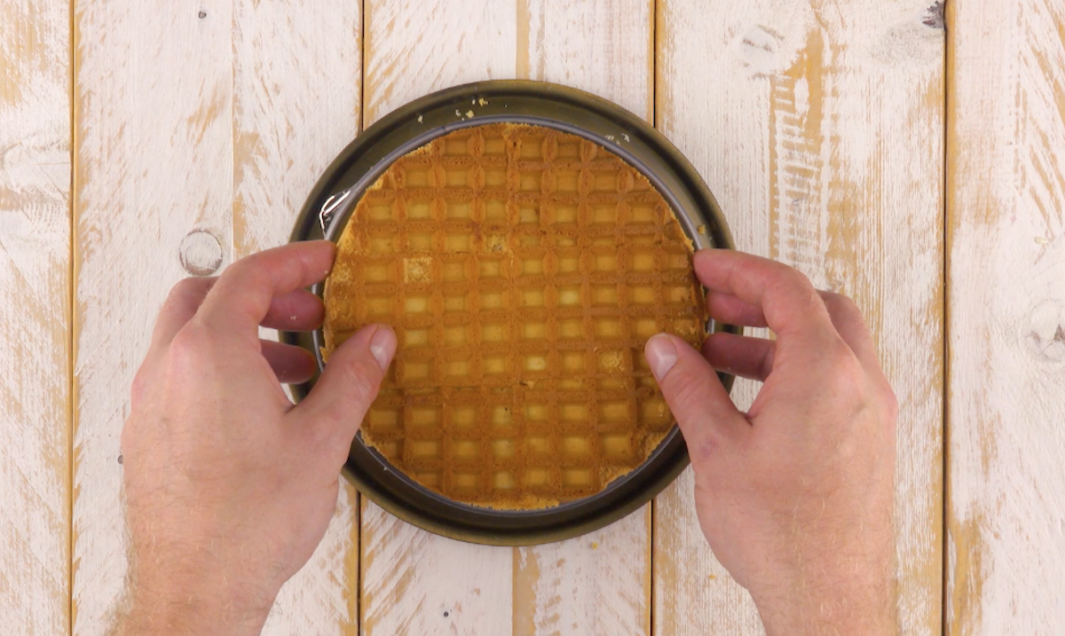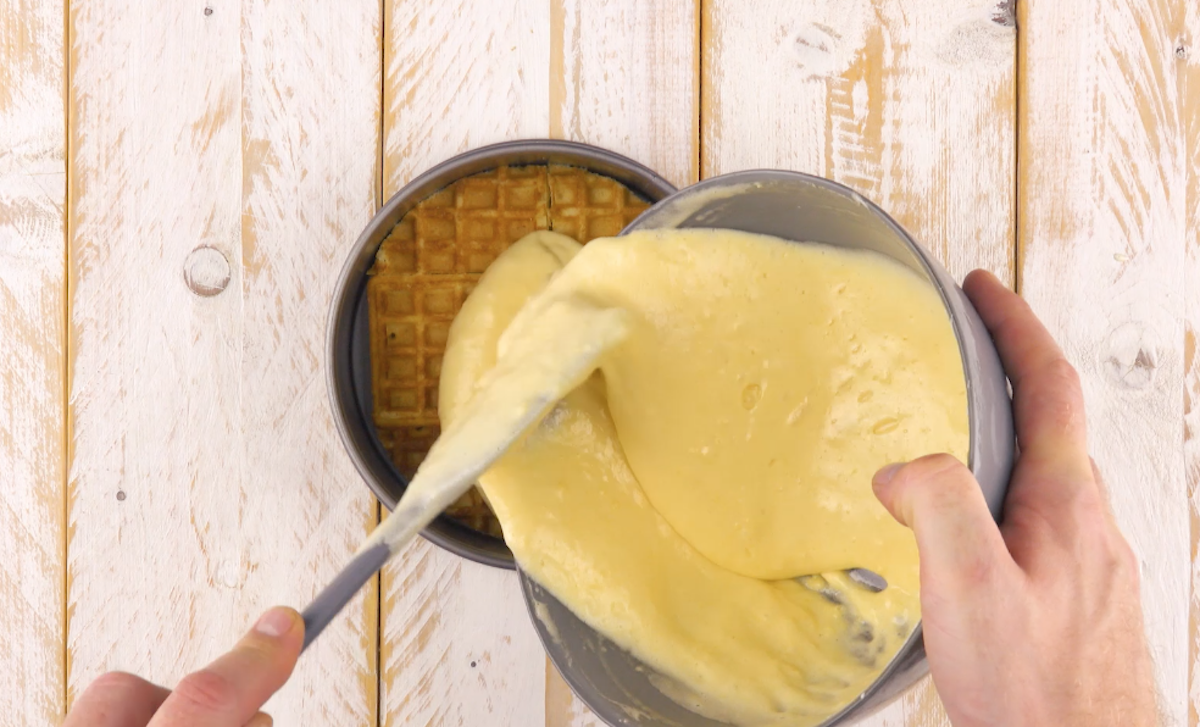 1.) Für den Biskuitteig schlägst du Eier und Zucker schaumig mit dem Handrührgerät auf. Dann fügst du Mehl, Stärke und Backpulver hinzu. Kleide den Boden einer kleinen Springform passend mit den zurechtgeschnittenen Butterwaffeln aus. Du kannst sie mit dem Ring der Springform ausstechen. Auf diese gibst du den Biskuitteig und bäckst ihn bei 190 ºC für 20 Minuten.
