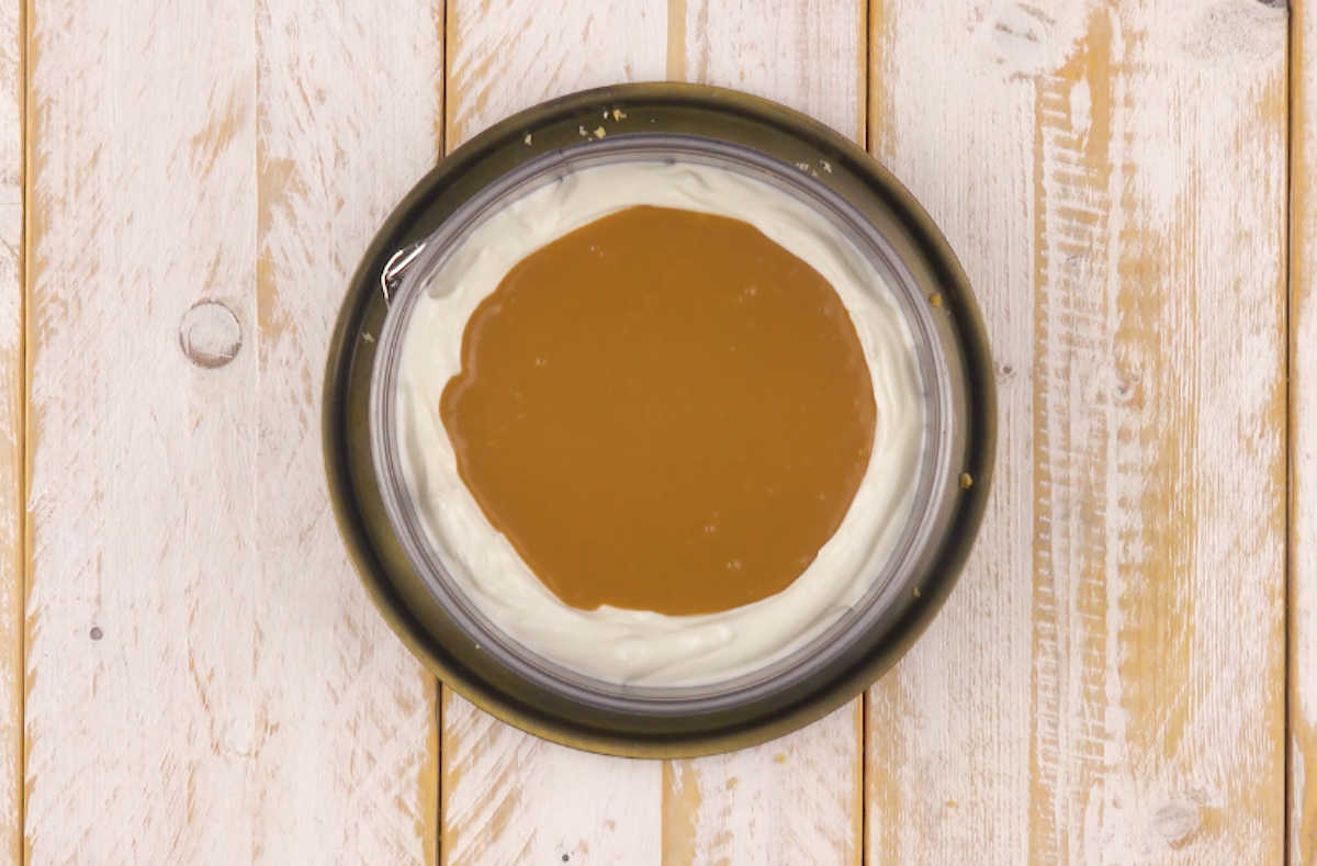 4.) Für die Karamellsoße lasse den Zucker vollständig bei mittlerer Temperatur im Topf karamellisieren, ehe du die Butter portionsweise hinzugibst. Gib dann die Sahne bei und lasse die Masse aufkochen. Zum Schluss rührst du den Haselnusssirup unter und kühlst die Masse im Kühlschrank. Abgekühlt gießt du die Hälfte auf die Creme. Das Karamell läuft dabei nicht vollständig zum Rand, sondern wird von einem Ring Creme gesäumt.