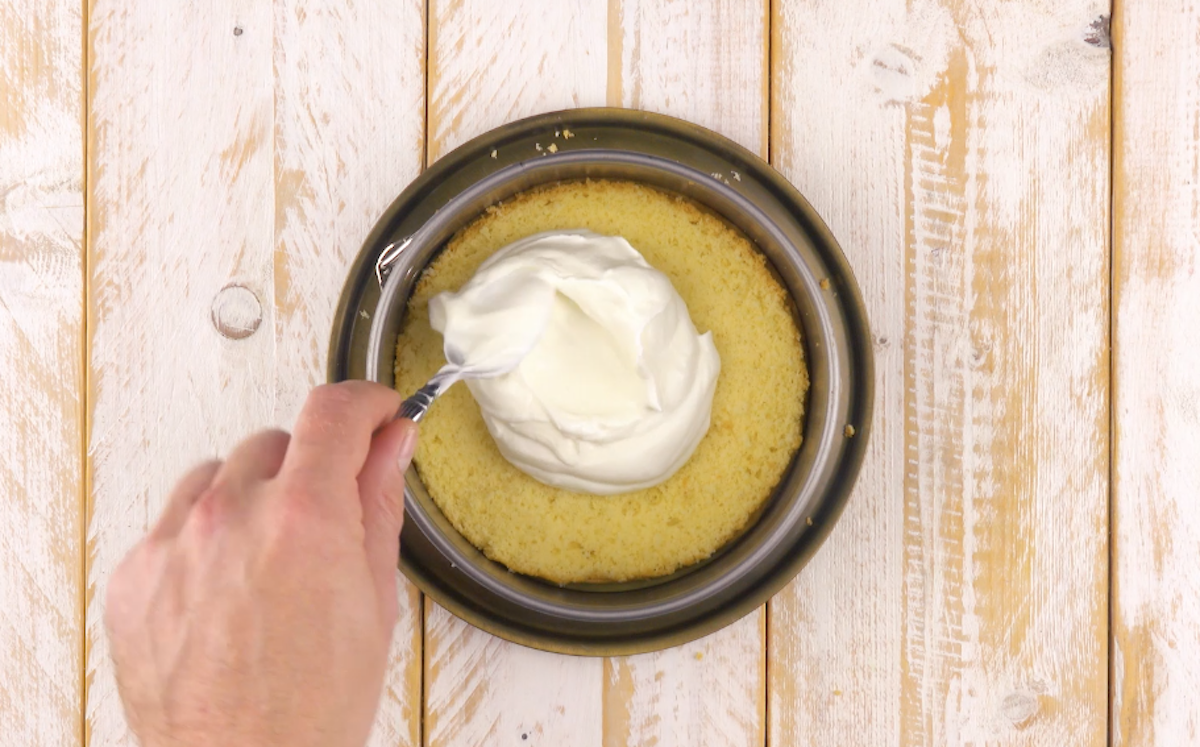 3.) Hebe Sahne und Vanillearoma unter die Mascarpone. Bestreiche nun den Kuchenboden mit einem Drittel der Creme.