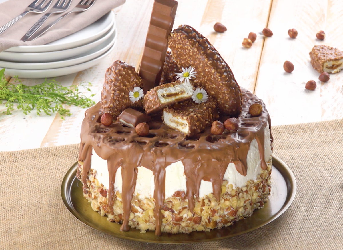 6.) Entferne die Springform und bestreiche die Tortenränder mit dem übrigen Drittel der Creme. Garniere die untere Hälfte mit gehackten Haselnüssen. Nun lässt du die Kinder Riegel über einem Wasserbad einschmelzen und gießt die Masse auf die Butterwaffeln, etwas Schokolade lässt du dabei den Rand hinunter laufen. Schließlich garnierst du die Torte nach Belieben mit Kinder Maxi Kings, Riegeln und Haselnüssen.