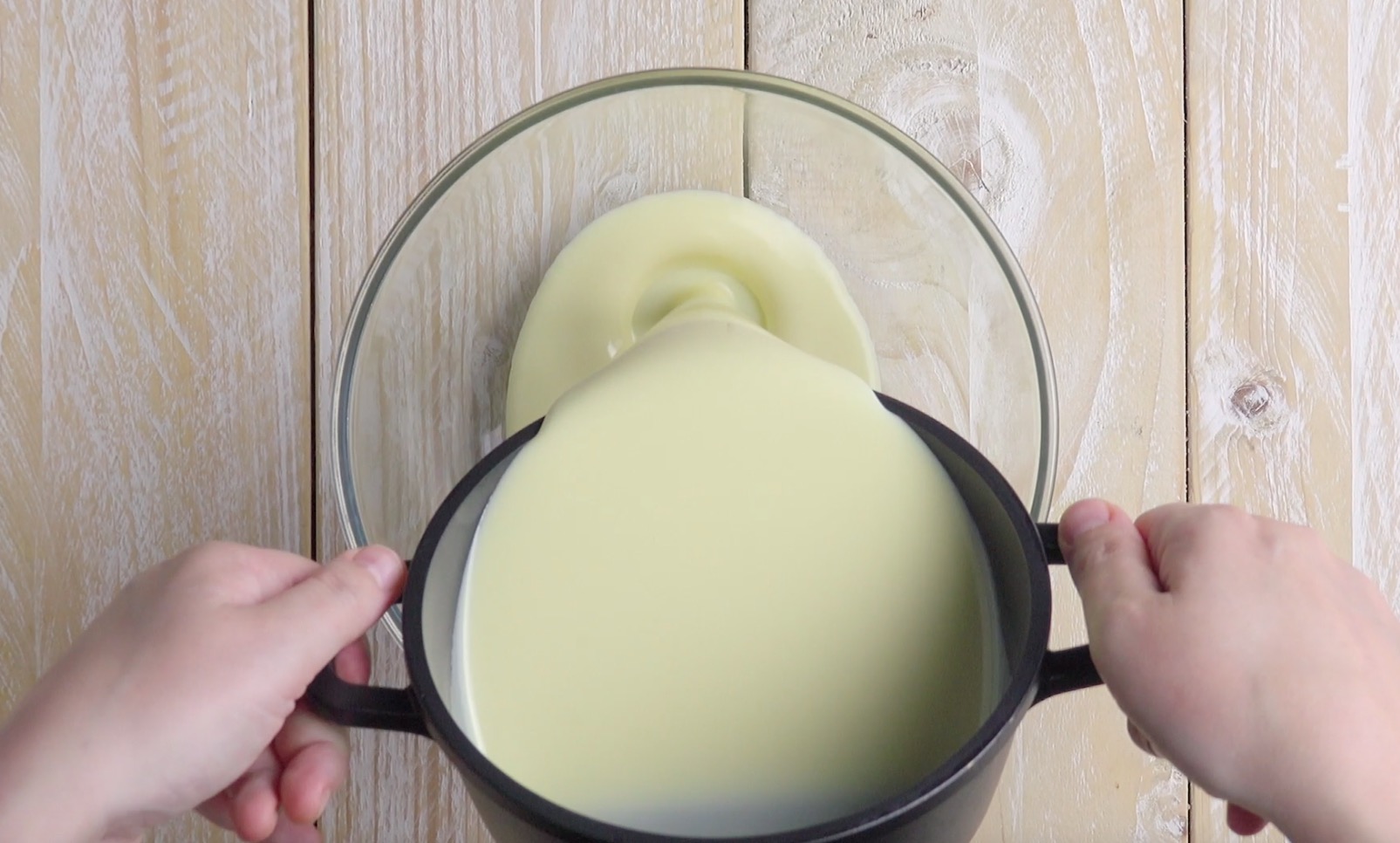 1.) Erhitze zunächst die Sahne in einem Topf. Kurz nachdem sie aufgekocht ist, gibst du die weiße Schokolade hinzu und lässt sie unter ständigem Rühren in der Sahne schmelzen. Nimm den Topf dann vom Herd und lass die Mischung abkühlen.