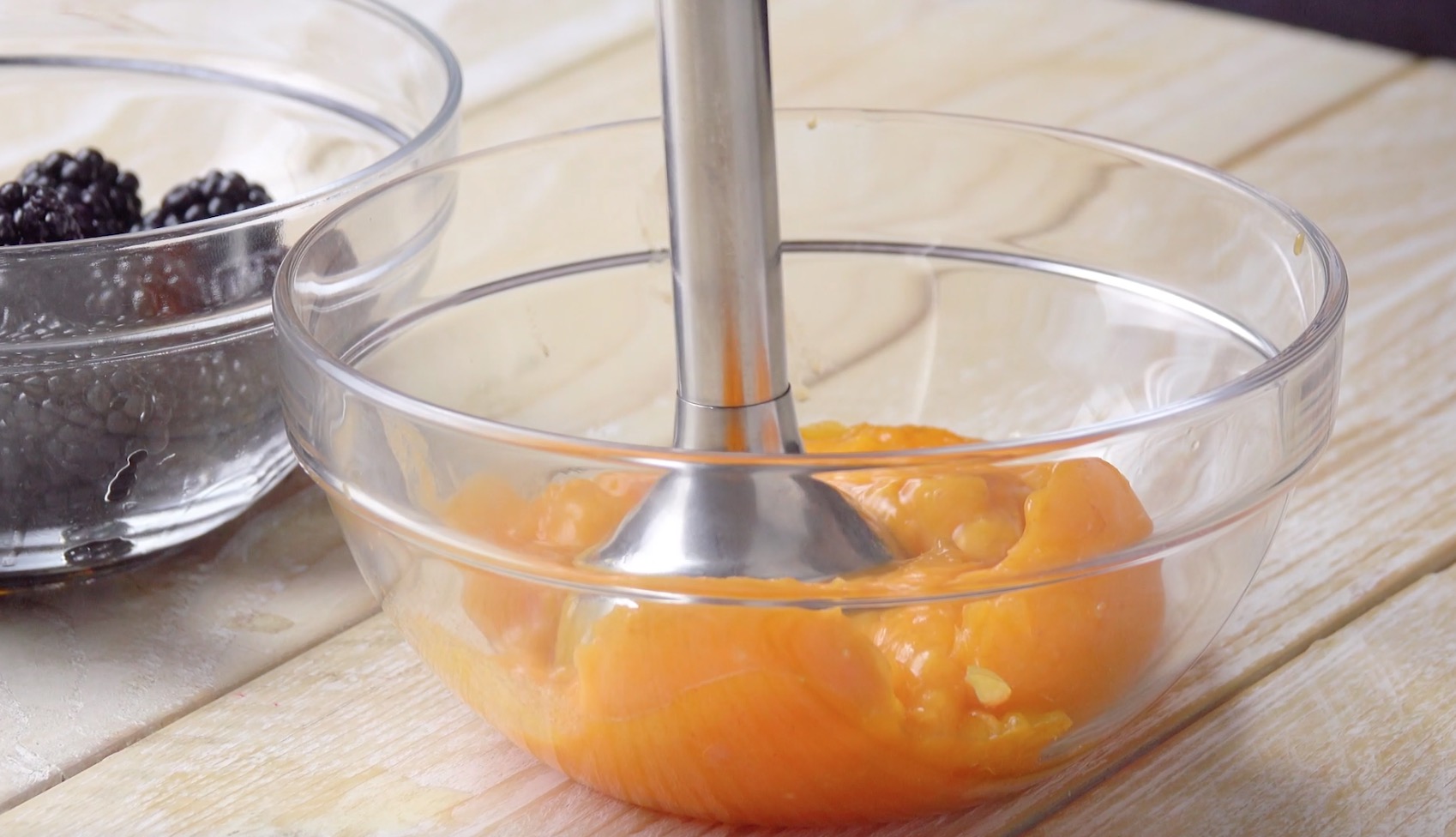 4.) Gib nun die halbierten Aprikosen und die Brombeeren in zwei separate Schüsseln. Gib zu beiden nach Belieben etwas Rum hinzu und püriere dann den Inhalt beider Schüsseln.