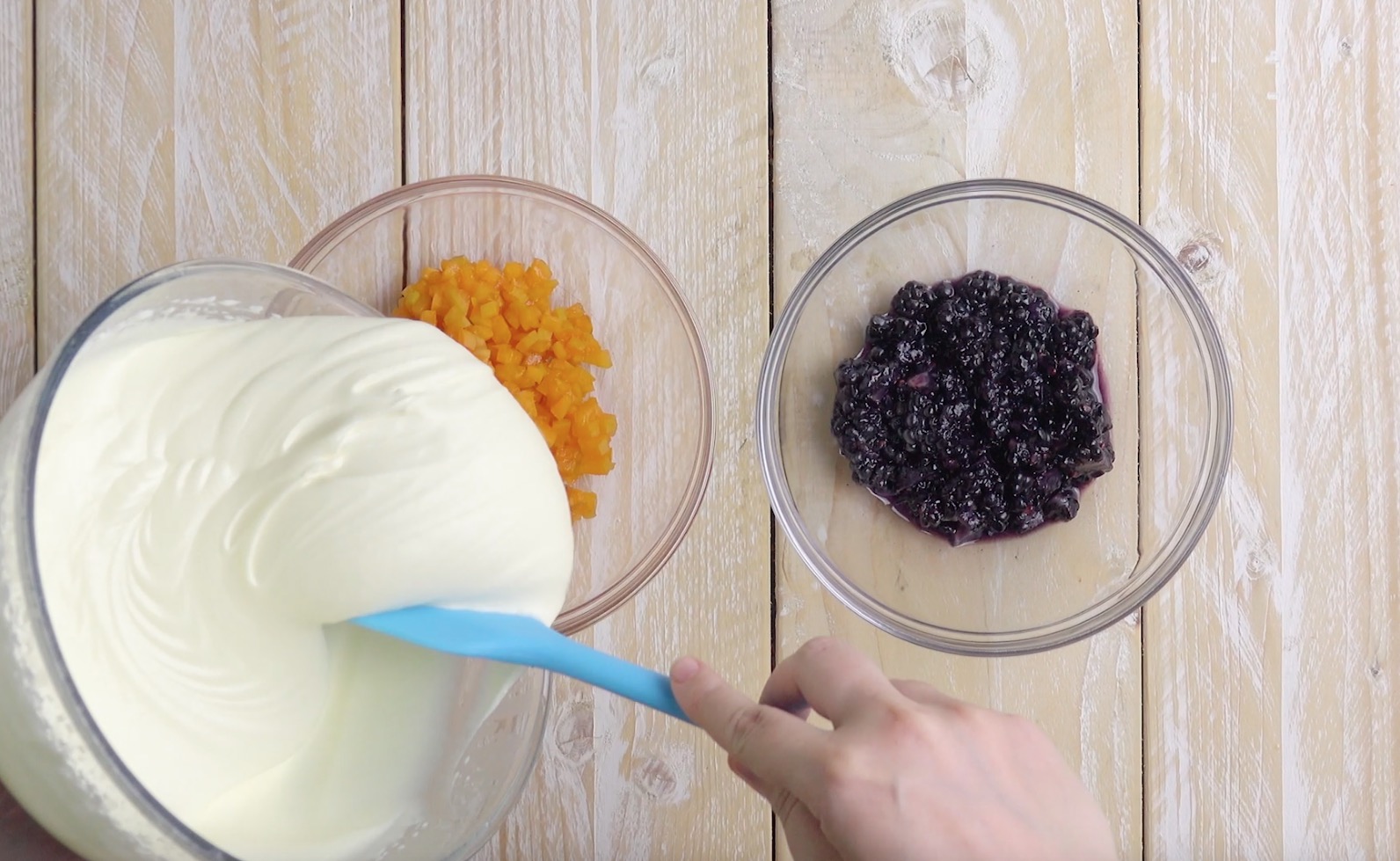 2.) Fülle nun die Aprikosen- und die Brombeerstückchen in jeweils eine Schüssel und verteile die Creme anschließend zu gleichen Teilen darauf. Mische dann in beiden Schüsseln die Frucht sorgfältig mit der Creme.
