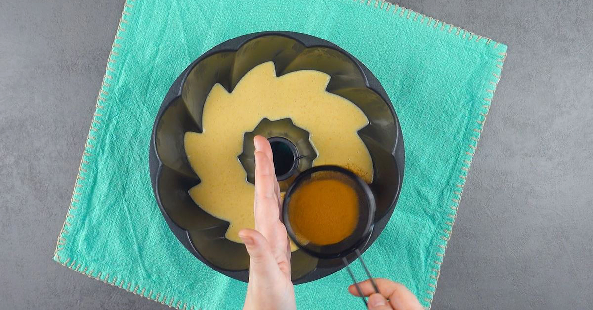 5. Fette nun die Gugelhupfform gut ein und gib den Teig abwechselnd in die Form, sodass am Ende vier Schichten entstehen. Beginne dabei mit dem hellen Teig.
