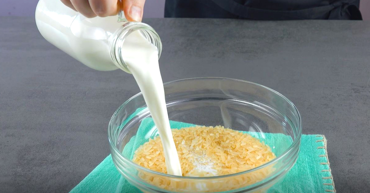 1. Vermische zuerst den Reis mit der Milch und verrühre beides gut miteinander. Lasse den Reis nun mindestens 3 Stunden, am besten aber über Nacht, einwirken. Der Reis sollte dabei ab und zu umgerührt werden.