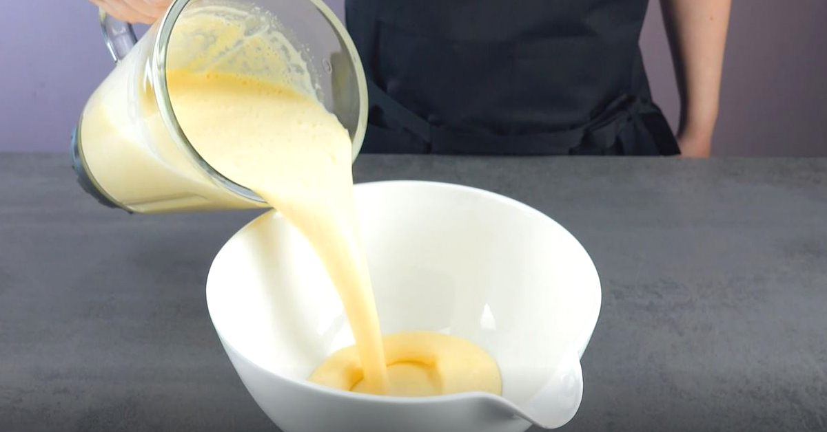 2. Gib die Reis-Milch-Mischung danach in einen Stabmixer und füge die Eier, den Zucker und das Öl hinzu. Mixe alles auf höchster Stufe für ungefähr drei bis vier Minuten gut durch und gieße die Masse danach in eine große Schüssel.
