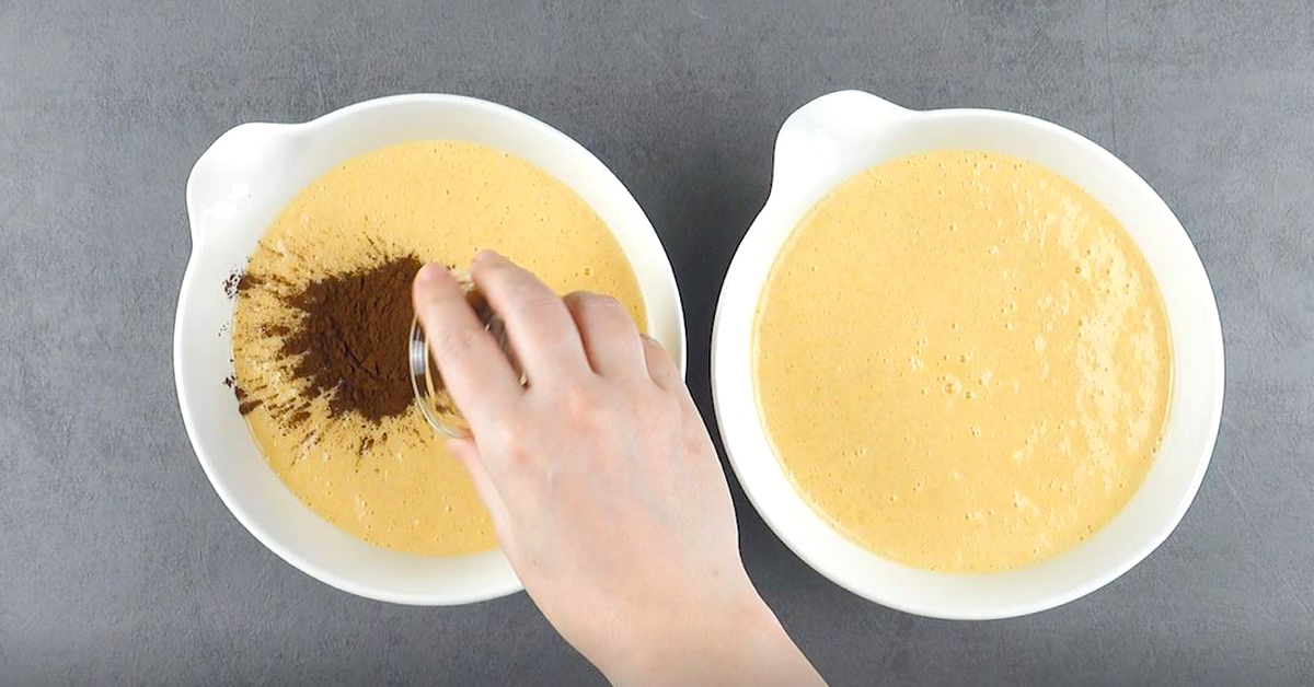 4. Teile den Teig anschließend zu gleichen Hälften auf jeweils eine Schüssel auf. Hebe danach das Kakaopulver unter eine der beiden Teighälften.